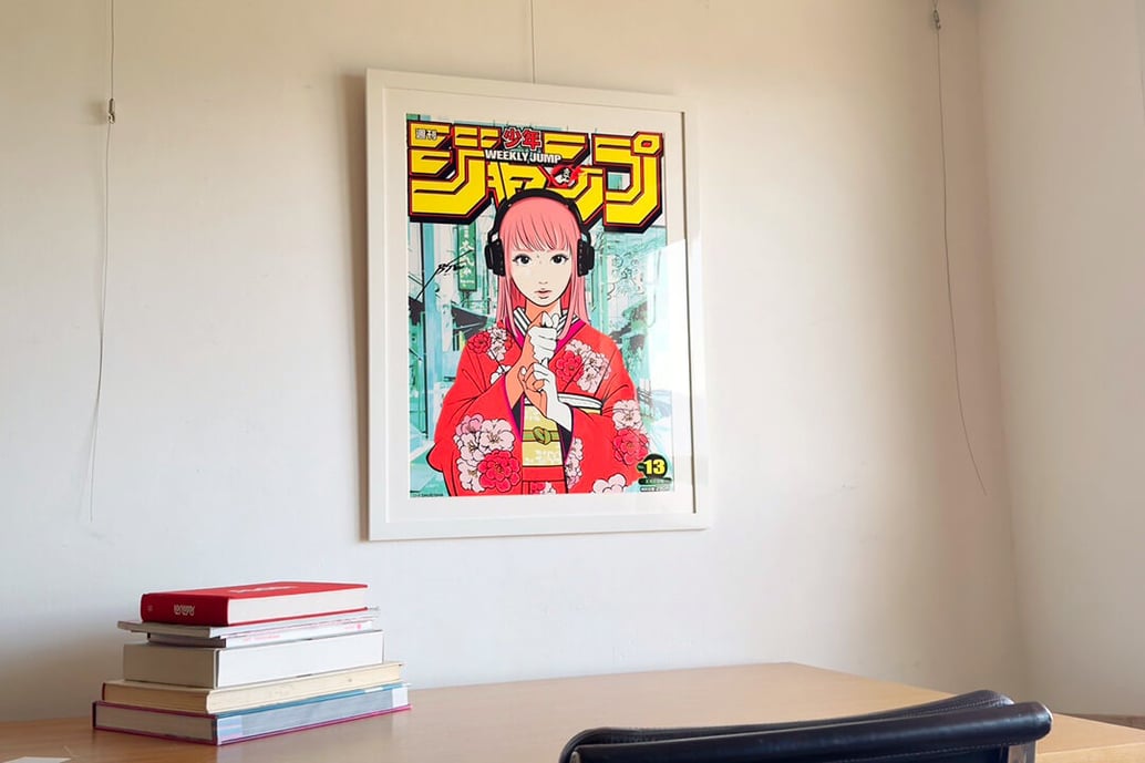 Backside works.(バックサイドワークス)の少年ジャンプ N0.13を額縁は「Eternity White」、マットボードは「ノーマル白」で額装しました。