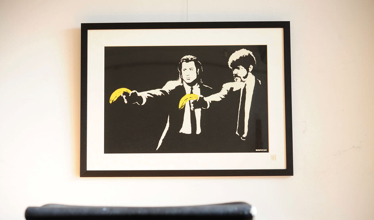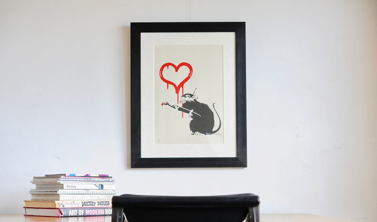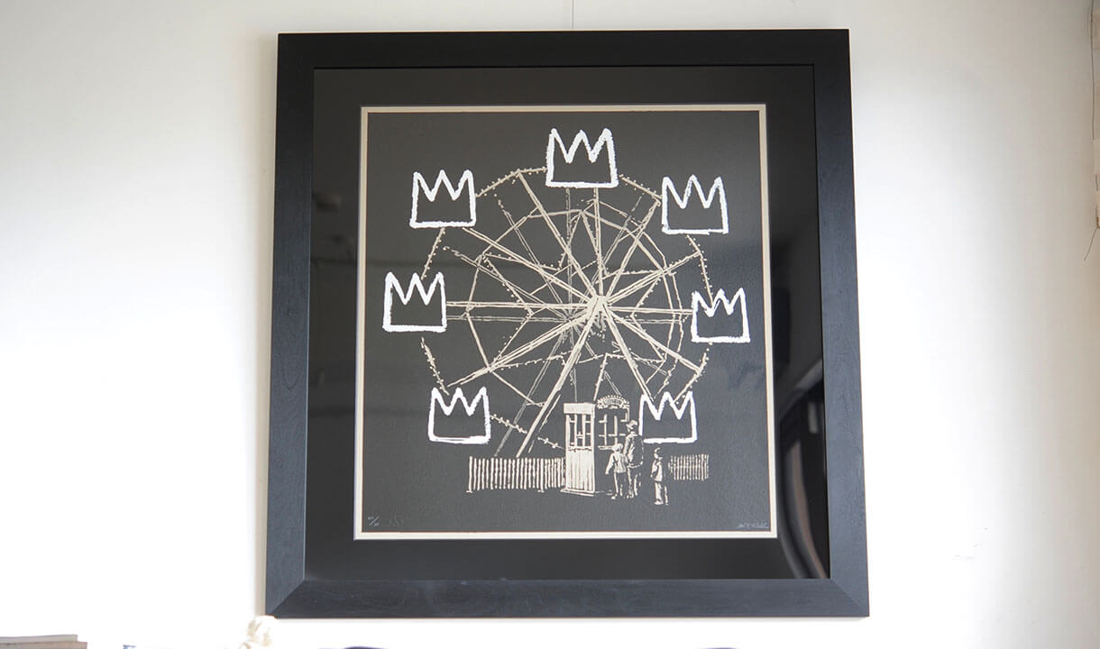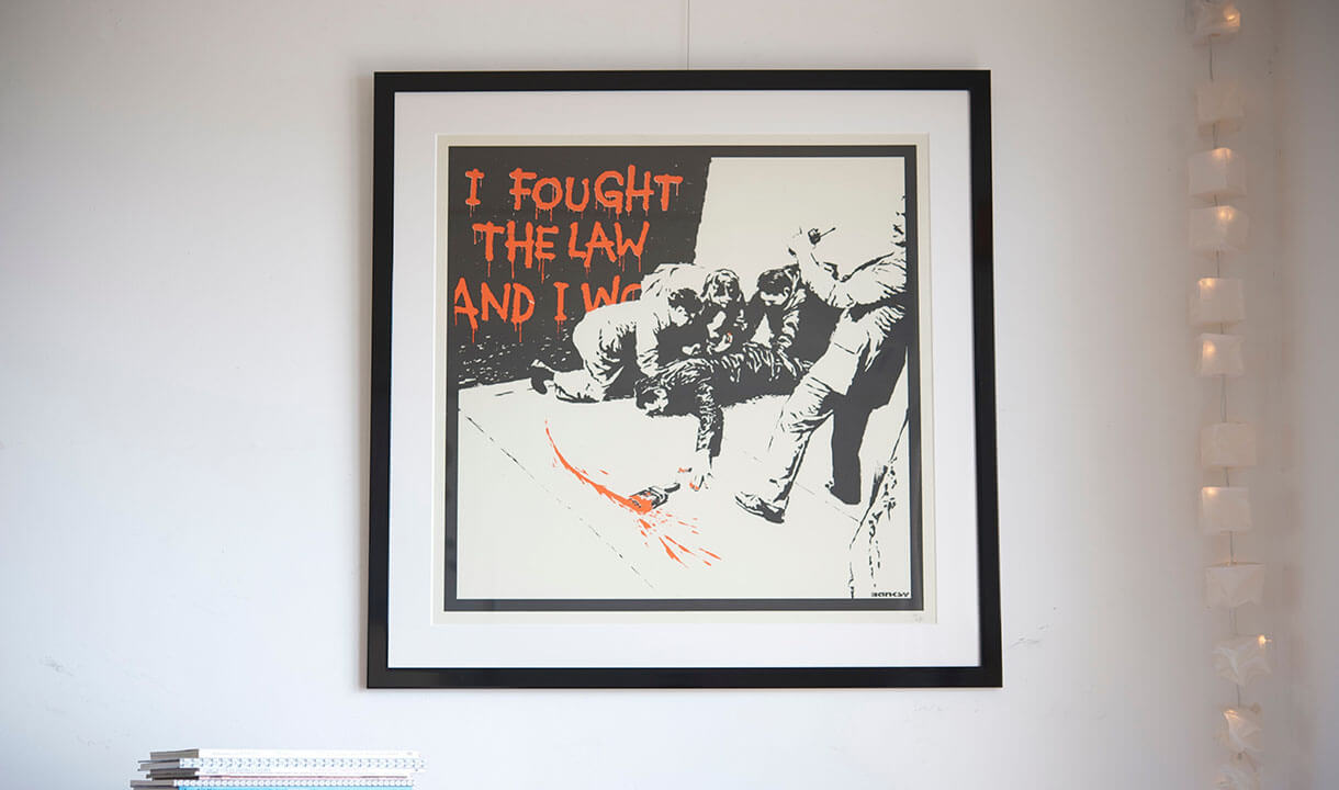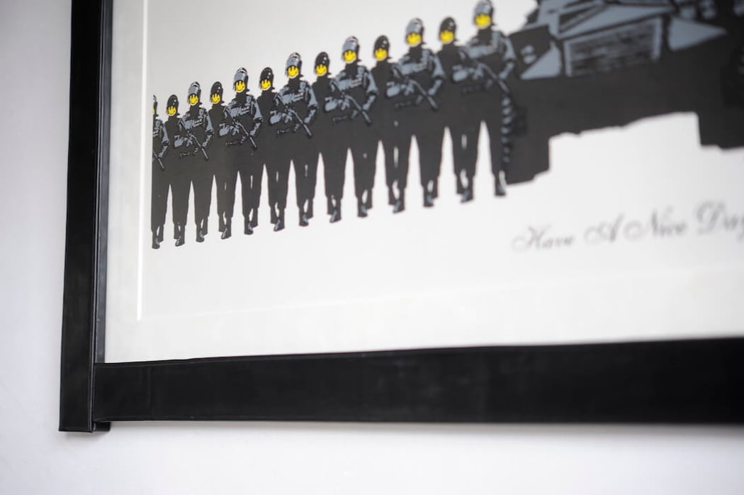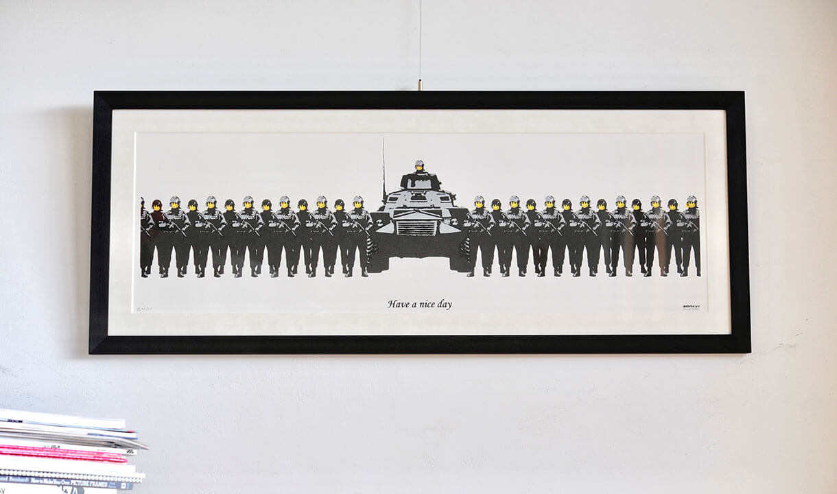 Banksy(バンクシー)の"Have a nice day"を額縁はこの作品のために製作した「wabisabi - leather」、マットボードは「コットンスエード白」で額装しました。