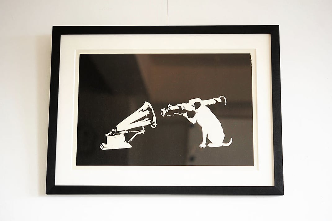 Banksy(バンクシー)の「HMV(プリンタープルーフ)」を額縁は「WALNUT Black」、マットボードは「コットンスエードの白で額装しました。