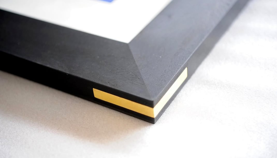 正面から見ると普通の額縁 WALNUT Blackなのですが、角度を変えてみると4角のサイドに本物の金箔を貼り込んだピースを埋め込んでいます。(通常のWALNUT