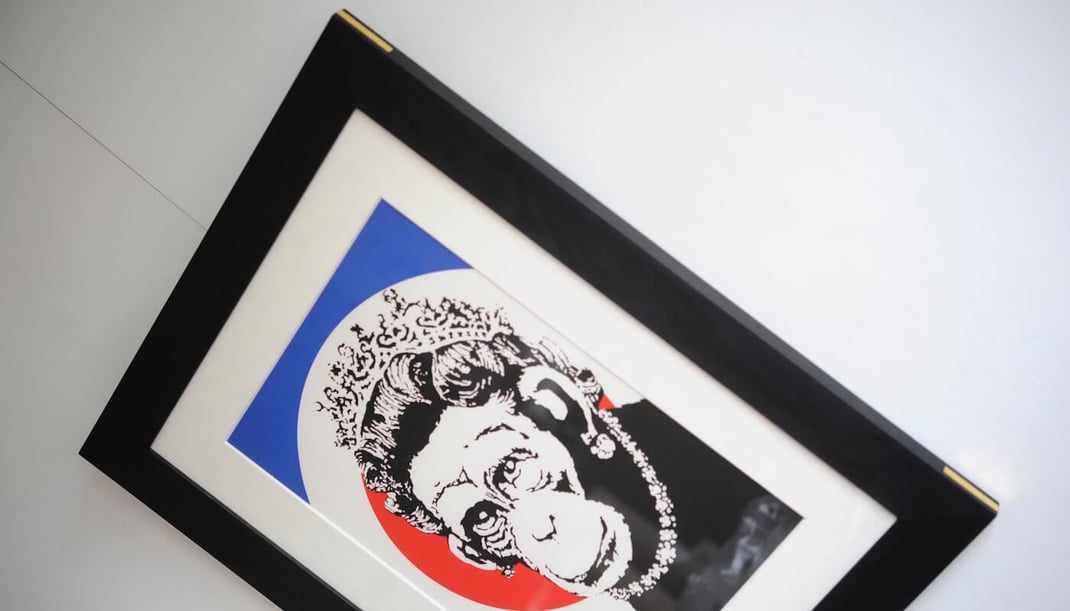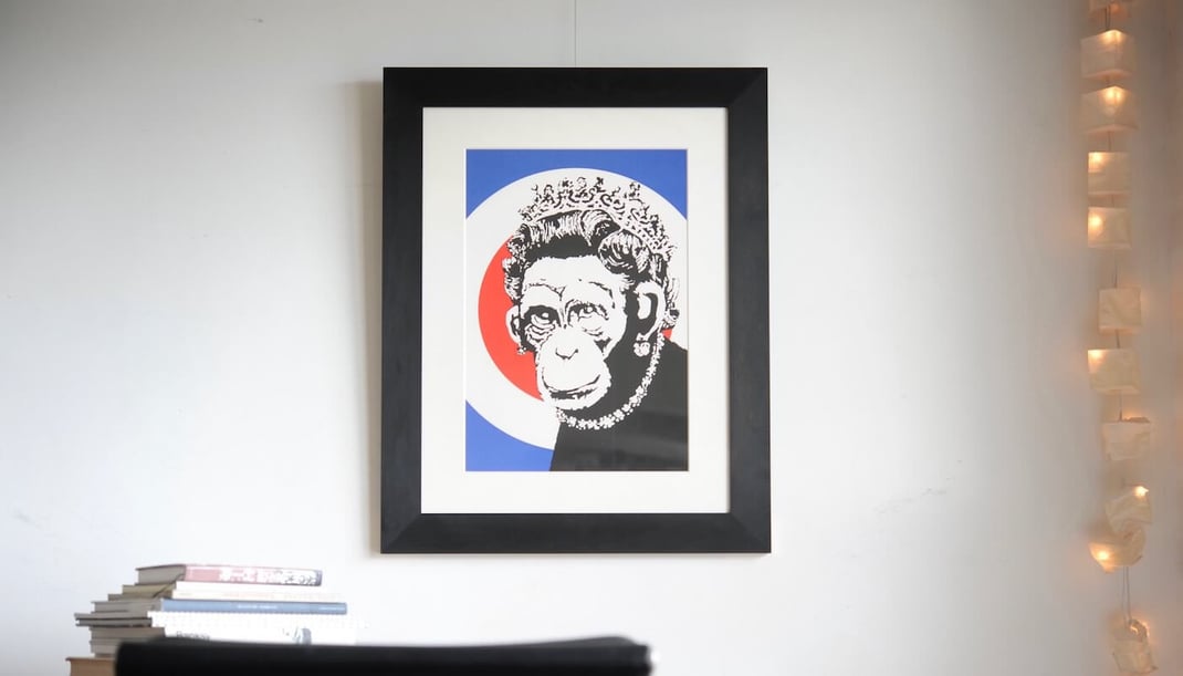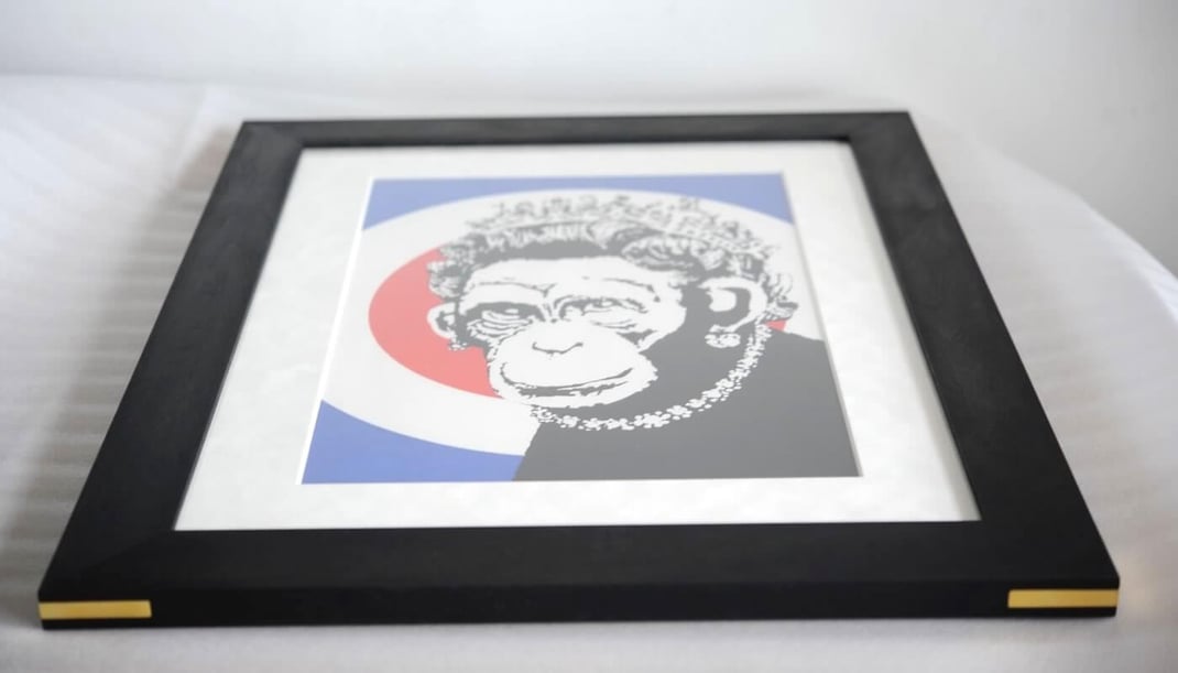 Banksy(バンクシー)のMonkey Queen(エディションナンバー入り、ペストコントロールCOA付き)を、額装は”WANLUT