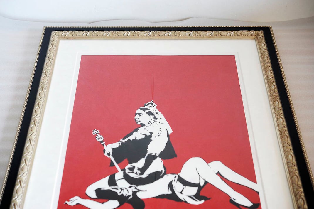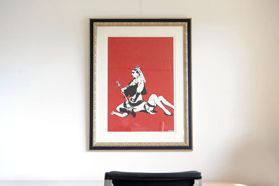 BanksyのQueen Victoriaを額縁は「NOISEPRINCE Silver」、マットボードは「コットンスエード白」で額装しました。