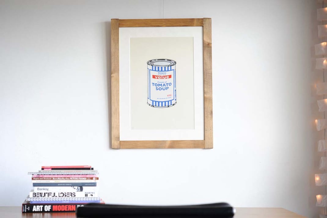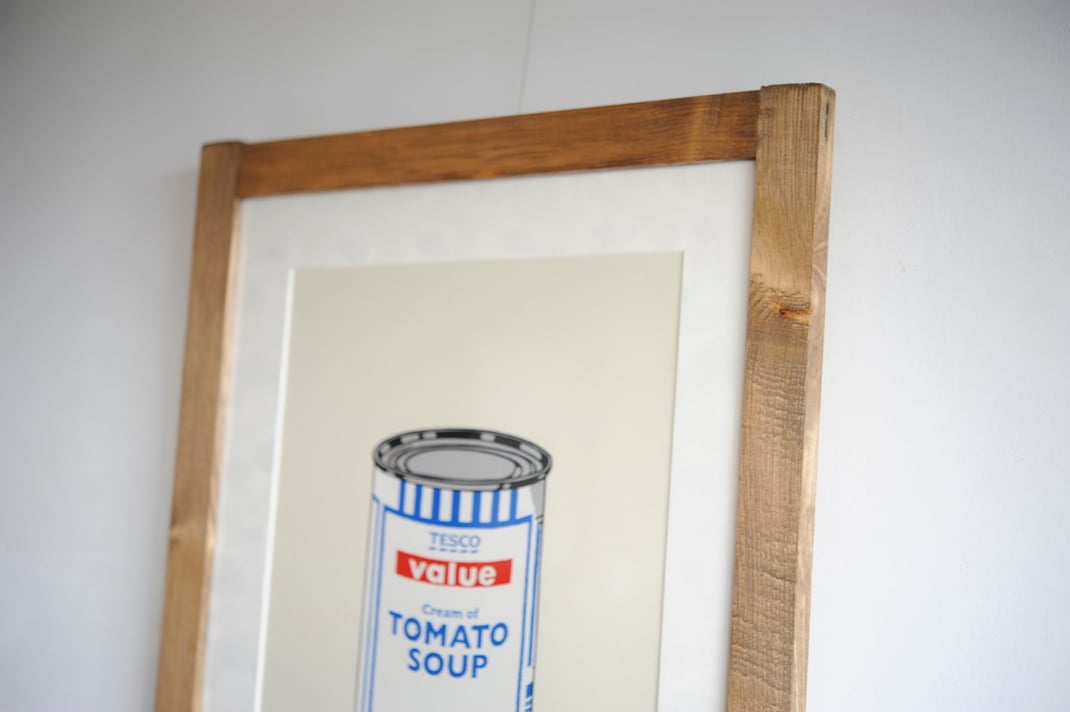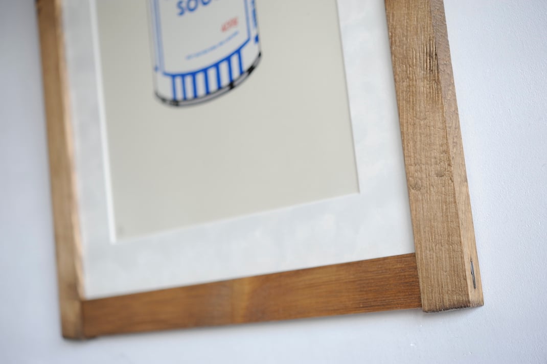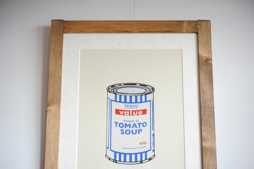 Banksy(バンクシー)のSoup Canを額縁はwabisabi natural antique、マットボードはコットンスエード素材の白で額装しました。