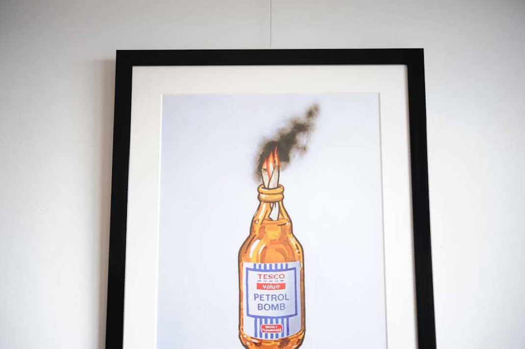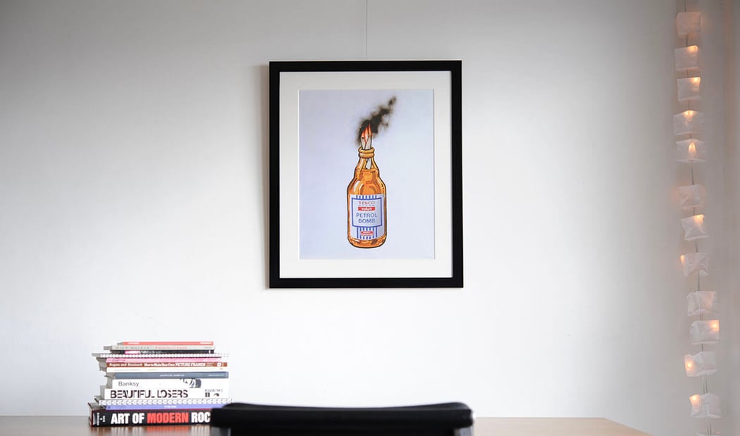 Banksy(バンクシー)の2000枚限定のプリント「TESCO Petrol Bomb」を額縁は「Eternity Black」、マットボードはノーマル白で額装しました。