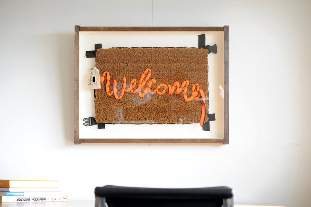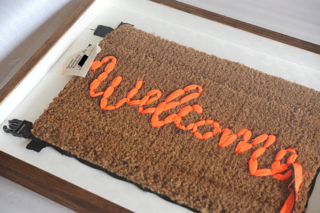 BanskyのWELCOME MATを額縁は「wabisabi natural antique」、マットボードは「コットンスエード白」で額装しました。