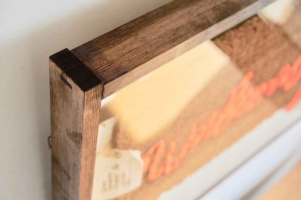 大量生産のなんちゃってアンティーク加工のフレームでは絶対に出すことのできない、新品なのに何十年もずっとそこにあった様なリアルな経年劣化を表現した「wabisabi natural antique」と、WELCOME MATのゴワッとしたラフな質感がハマっています。