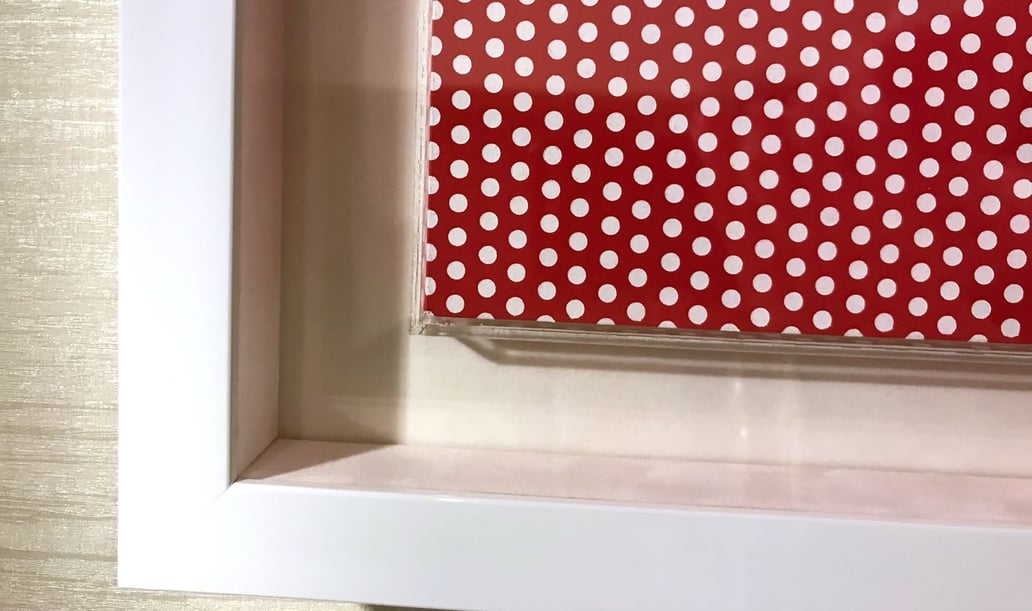 この特注のアクリルケースを使った額装だと作品をこちらにお送りいただかず製作出来ることに加えて通常、キャンバス作品を額装に固定する際は、作品の裏をビスを使って留めますが(もちろん作品へのダメージを最小限にとどめる一手間かけた留め方をしています)アクリルのケースの中に納めるので作品の裏面には一切、手を加えずに額装できるという大きなメリットも得られます。