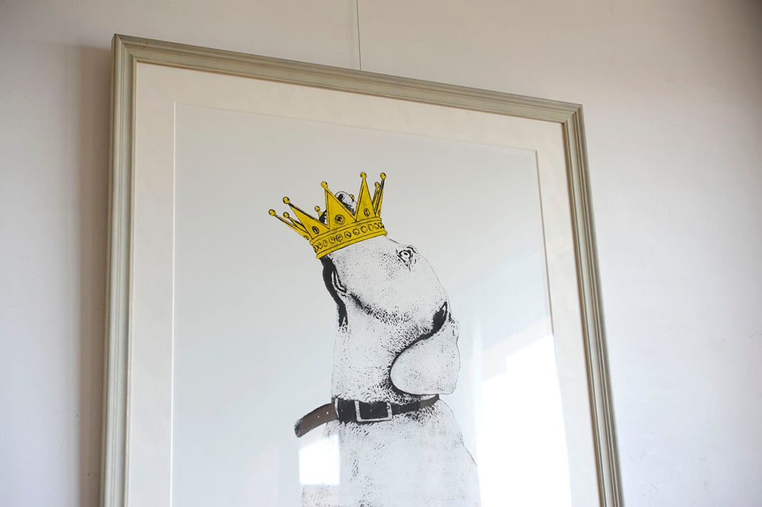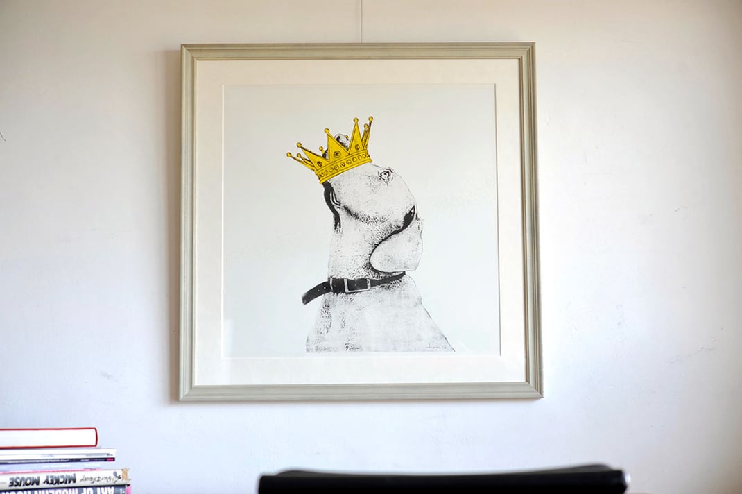 シンプルな白の額縁ではなく、少しデコラティブで絶妙なエイジング感がある、額縁 Italian Whiteを合わせる事で、ストリートアート色の強い作品でありながら、上品で日本のお部屋に馴染みやすい額装に仕上がっています。
