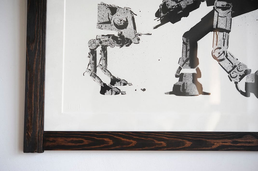 スプレーを吹き付けた感じ(この作品はステンシルスプレーペイントで製作した原画を版に起こしたシルクスクリーン印刷ですが)が、額縁 wabisabi black brownの枯れた感じと言うか、エイジング感と凄くマッチしています。