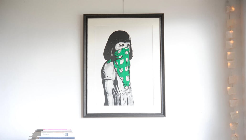 9枚しか存在していない、DOLKのKitty Riot(キティライオット)のグリーンを額縁は「Italian Black」、マットボードは「コットンスエード素材の白」で額装しました。