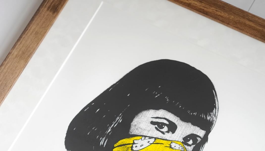9枚しか存在していないのである意味、Banksyの平均的なエディション作品よりも入手が難しい、DOLKのKitty Riot(キティライオット)のイエローを額縁は「wabisabi natural antique」、マットボードは「コットンスエード素材の白」で額装しました。