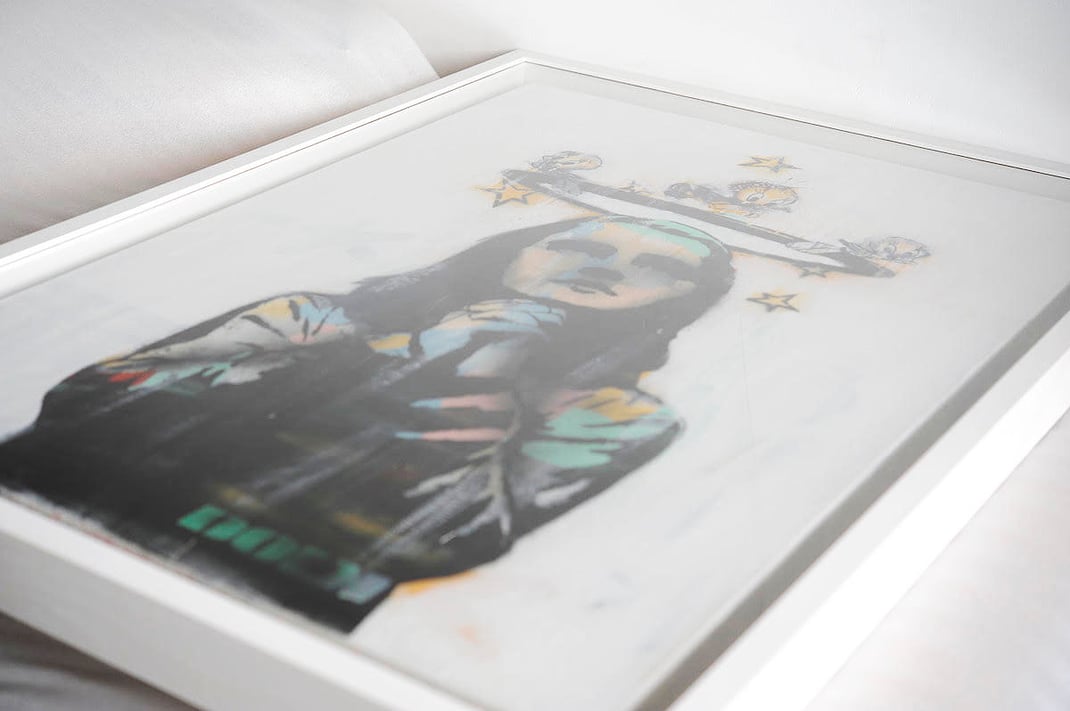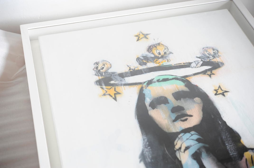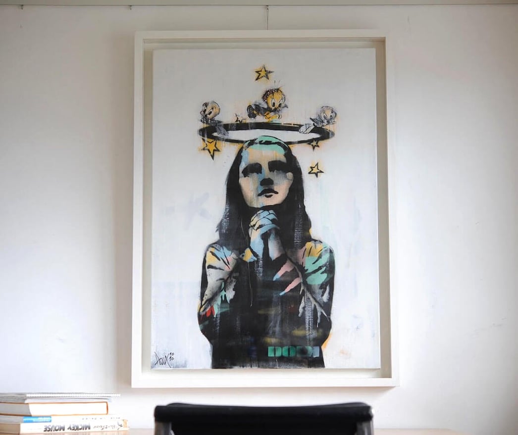 DOLKの数ある作品でも間違いなくベスト10に入る、人気の【Praying Girl】のしかも、キャンバス作品を日本で入手するのは難しいと思うのですが、この【Praying Girl】は少女がステンドグラスのようにカラフルにアレンジされた特別なオリジナル作品になります。