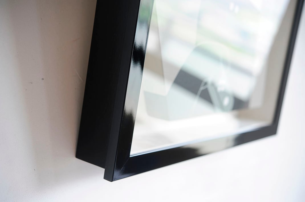 調べてみると、その当時はアクリルBOXで飾るか、上の写真のキャンバス作品のようにピッタリとフレームにはめ込む方法しかありませんでした。 キャンバスの木枠も含めて、キャンバス作品全体に魅力を感じていたので、せっかくの立体感が消されてしまう従来のキャンバスの額装に、その時、とても違和感を感じました。