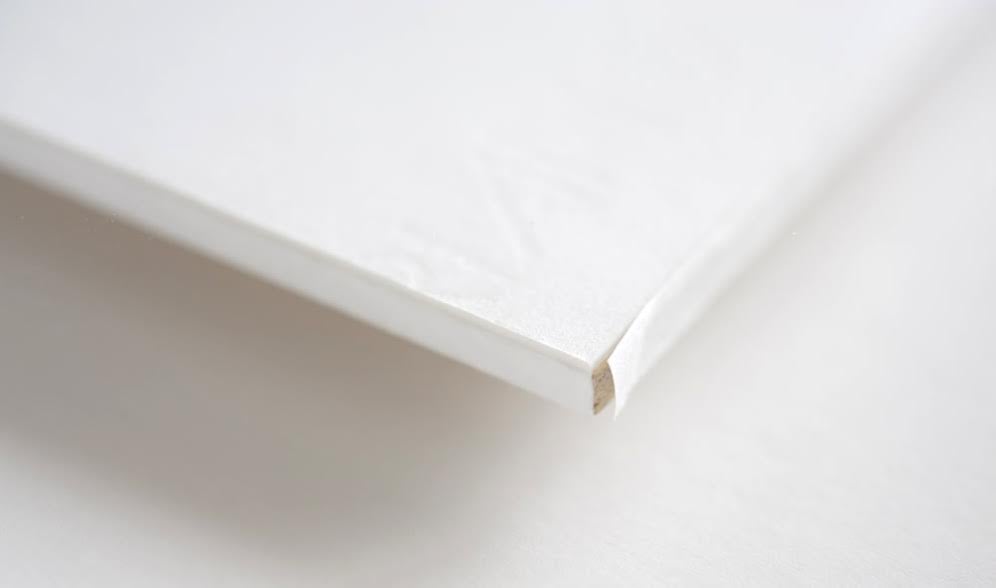 ベニヤ板の側面が見えると美しくなくなるので、側面には作品の紙に合わせて白い紙を貼っています。