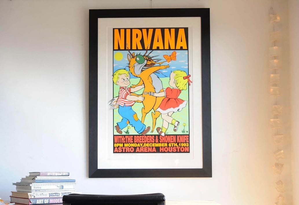 Frank Kozik(フランク・コジック)の最高傑作であり、ローブローアートの至宝「NIRVANA」を額縁 は「WALNUT Black」でマットボードは「コットンスエード素材の白」で額装しました。