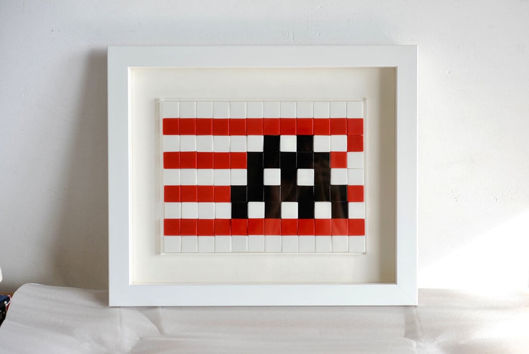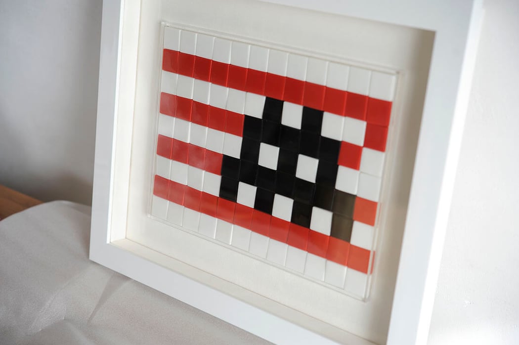 Invader(インベーダー)のInvasion Kit #18 L.A.を額縁は「Eternity White」、マットボードは「コットンスエード白」で額装しました。
