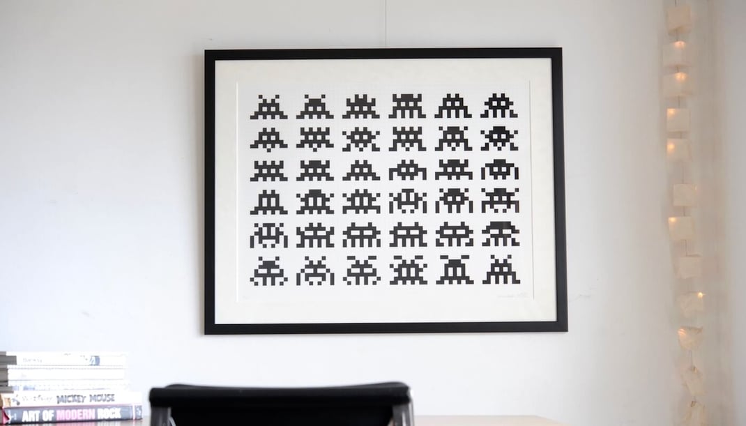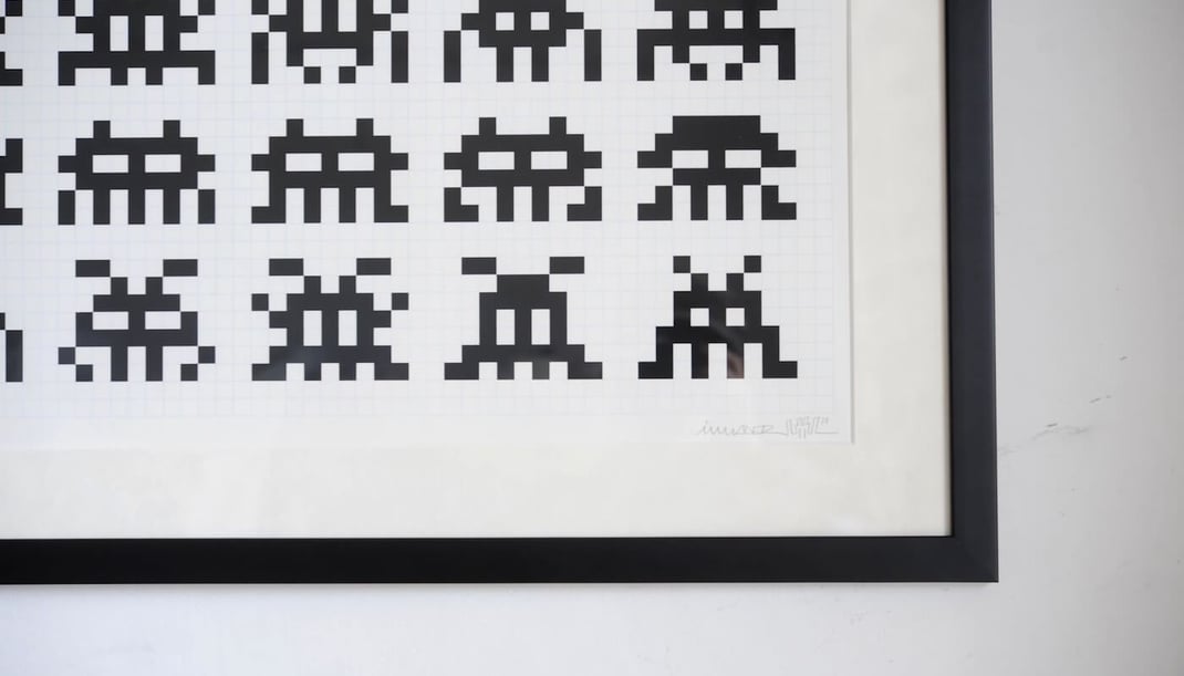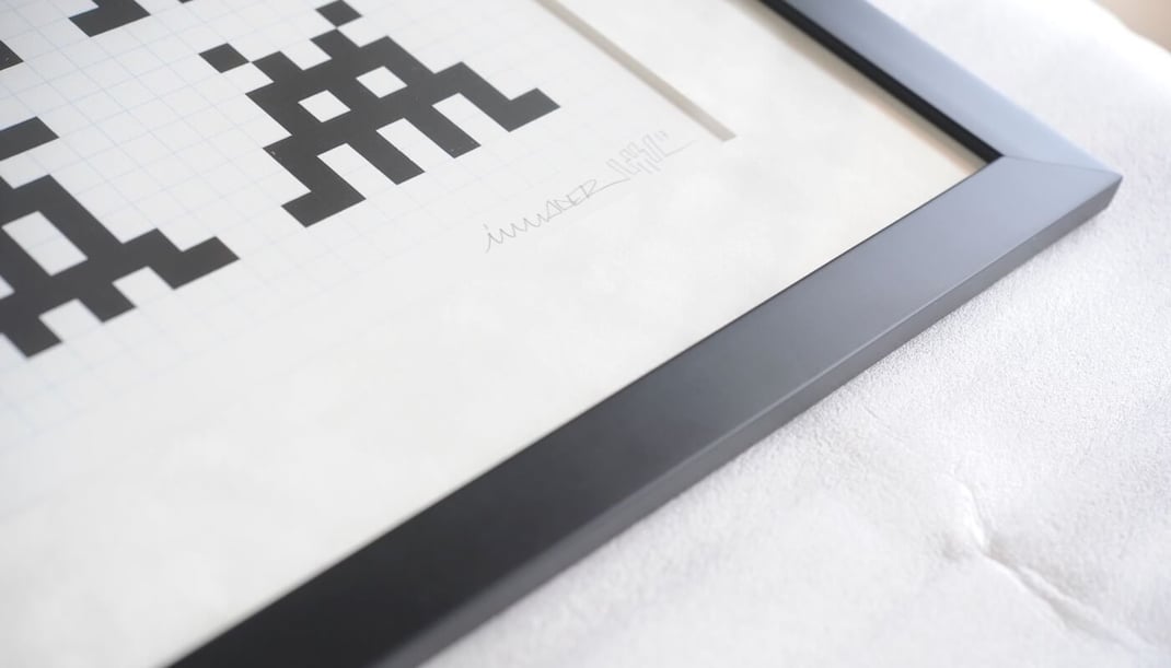 現在は100万円を超えているInvader(インベーダー)のシルクスクリーン作品「Repetition Variation Evolution」を額縁は、Eternity Black(ツヤなし)、マットボードはコットンスエード素材の白で額装しました。