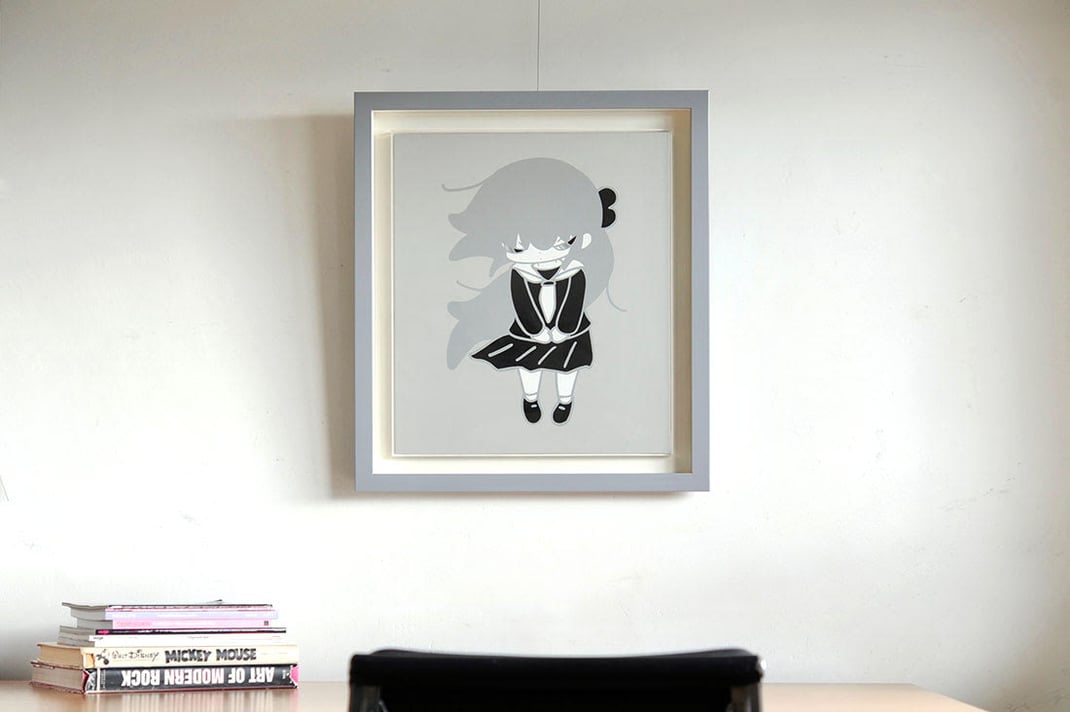 カメ子カメ男の「らしくないよ、今の君。」を額縁は「Eternity Grey」、マットボードは「コットンスエード白」で額装しました。