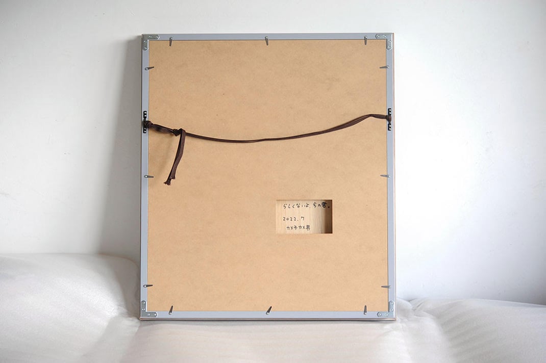 写真だと見えないので、裏板をくり抜いているだけだと思われる事が多いのですが、くり抜き部分にもアクリルを付けているので、作品が剥き出しになる事はなく、長期間飾っても埃などが付着する心配がありません。