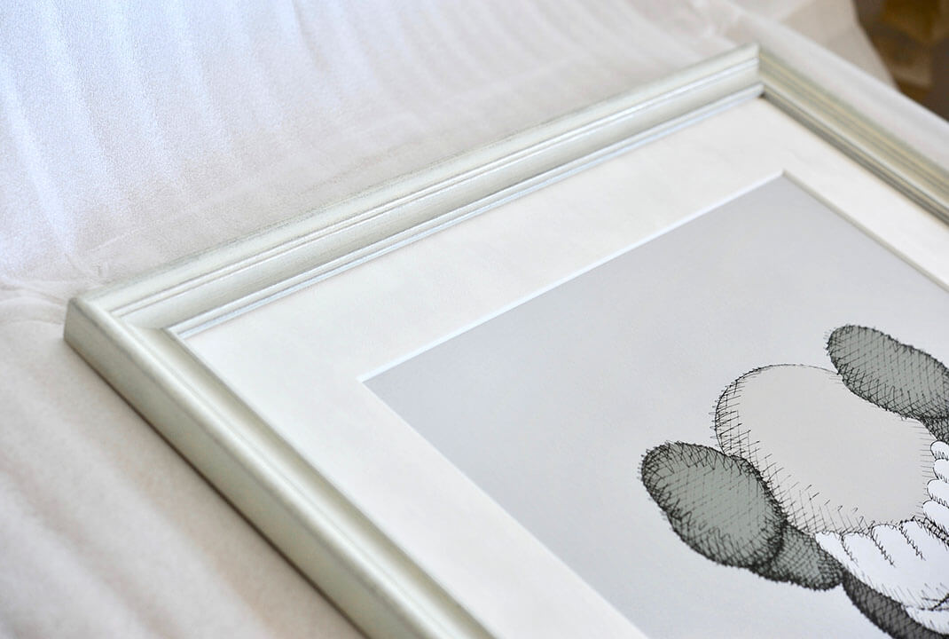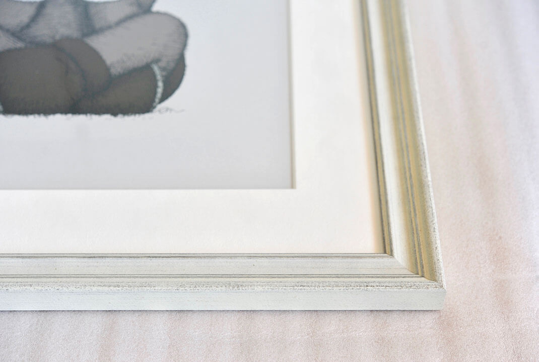 シンプルな白の額縁では無く、少しデコラティブで絶妙なエイジング感がある額縁「Italian White」を用いる事で、ストリートアート感の強い作品でありながら、ラグジュアリーで現代アート寄りのコレクターにも受けが良く仕上がっています。