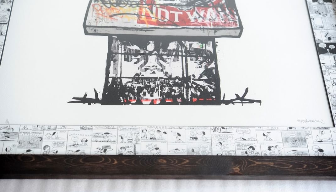 Kenny Random(ケニー・ランダム)の"Hard Times - Obey Giant"を額縁は「wabisabi black brown」、マットボードは「ビンテージコミックのパッチワーク」で額装しました。