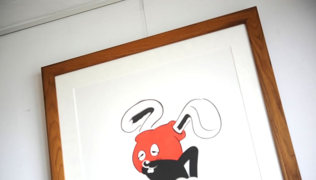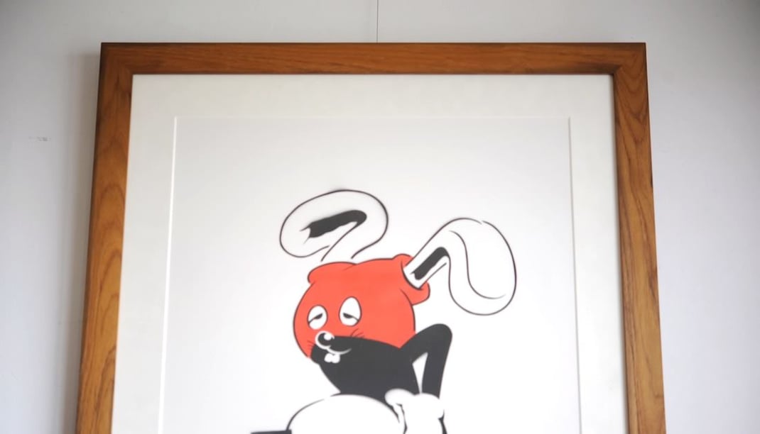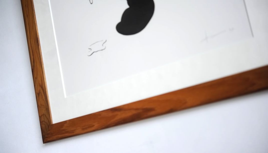 Kurry(カリー)の作品 "Mickey Masu(ミッキーマス)"を額縁は「TEAK(チーク)」、マットボードは「コットンスエード素材の白」で額装しました。