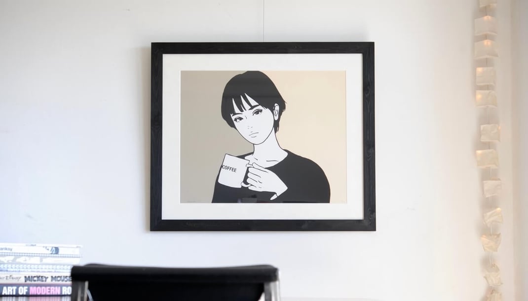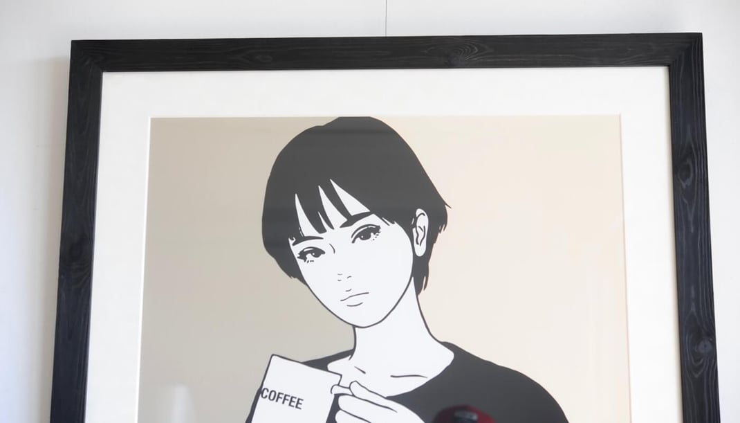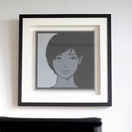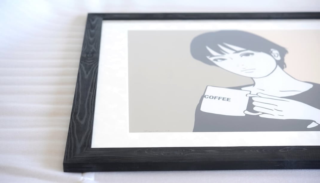 KYNE(キネ)の昨年(2018年)リリースされたシルクスクリーン作品(無題)を、額縁は「wabisabi chacoal」、マットボードは「コットンスエード素材の白」で額装しました。
