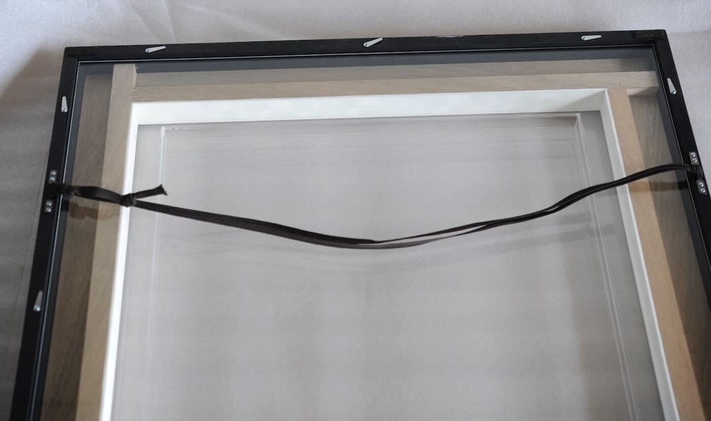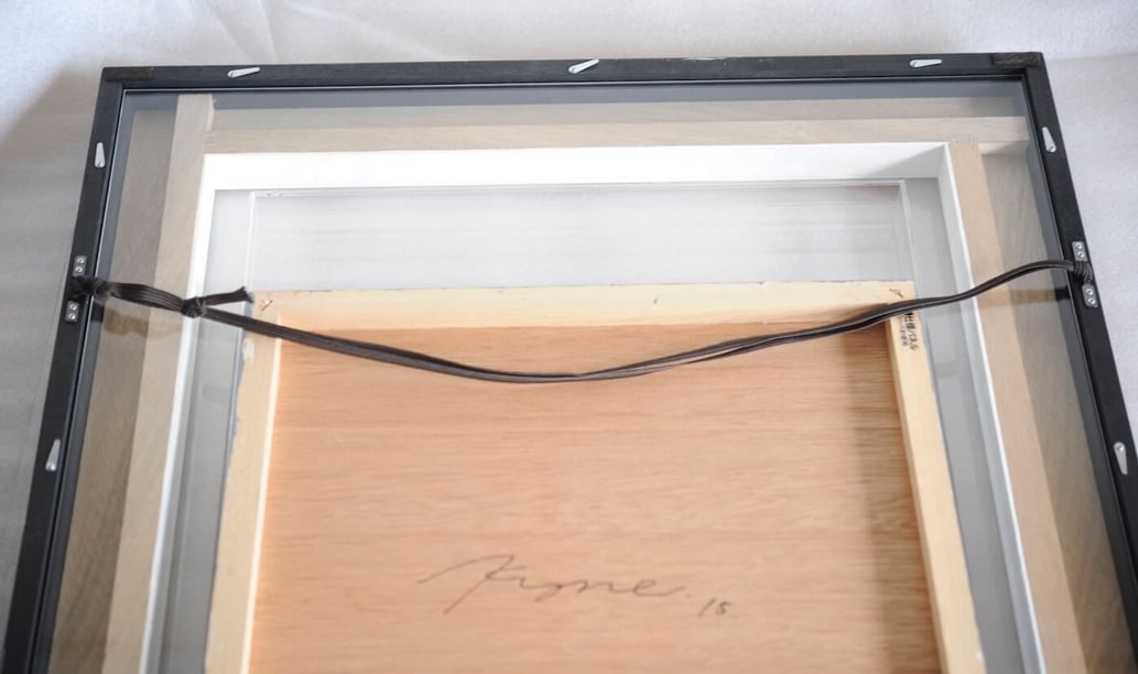 通常、このような立体の作品を額装に固定する際は、作品の裏をビスを使って留めます。