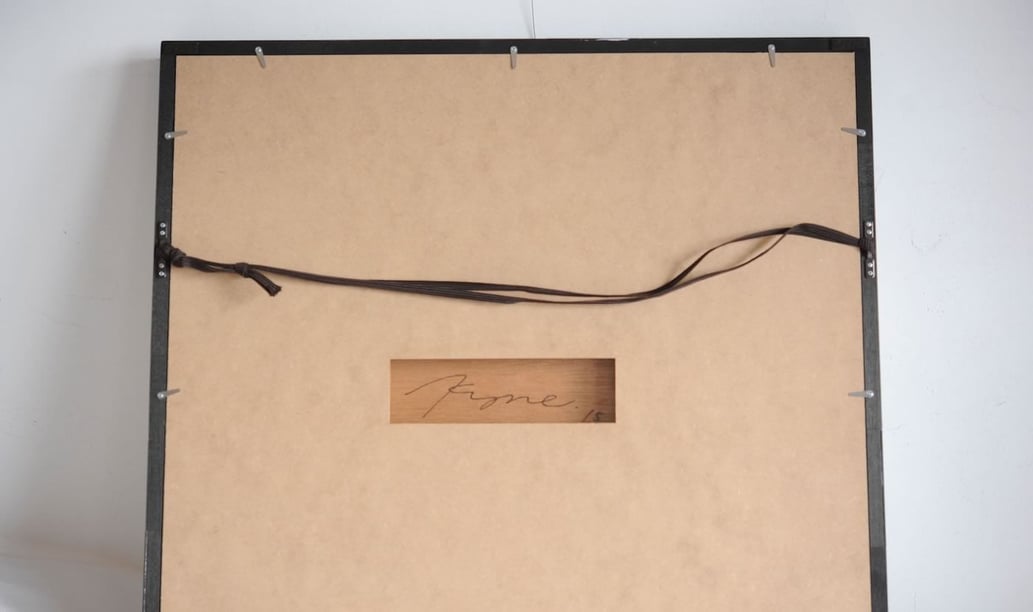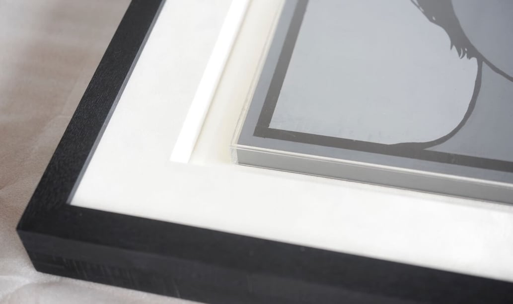今後、更なる価値が上がることが確実な作品ですし、作品サイズも比較的、小さいのと、T様の予算に余裕があったので凸型に特注で製作したアクリルのケースに納めています。(ケースと行っても背面は裏板が来るので、アクリルは付いていませんが)
