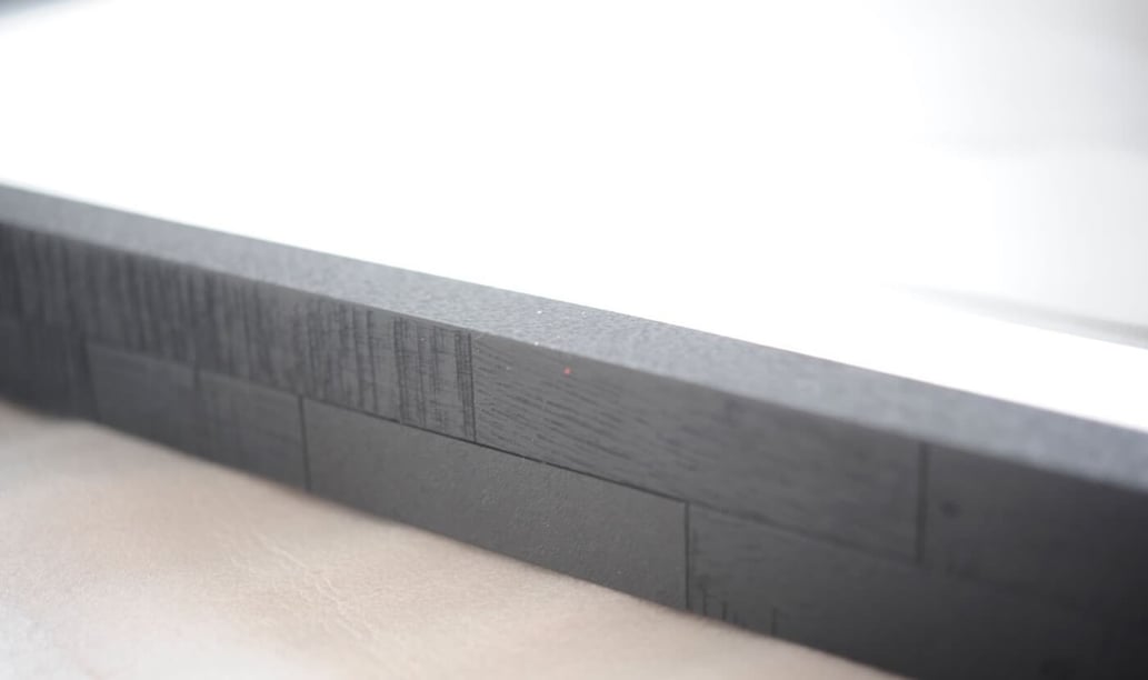 KYNEの作品と言えば白いシンプルな額装のイメージが強いですが、こちらはKYNEの作品には珍しい黒とグレーのグラデーションを基調としたシックな作品ですから、白より黒いフレームの方が良いなと直感的に思いましたし、ハンドペイントの刷毛のタッチとストロークが味わい深いのでフレームも味のあるのが良いなと思い、「Patchwork2 Black」を一推しで提案させていただきました。