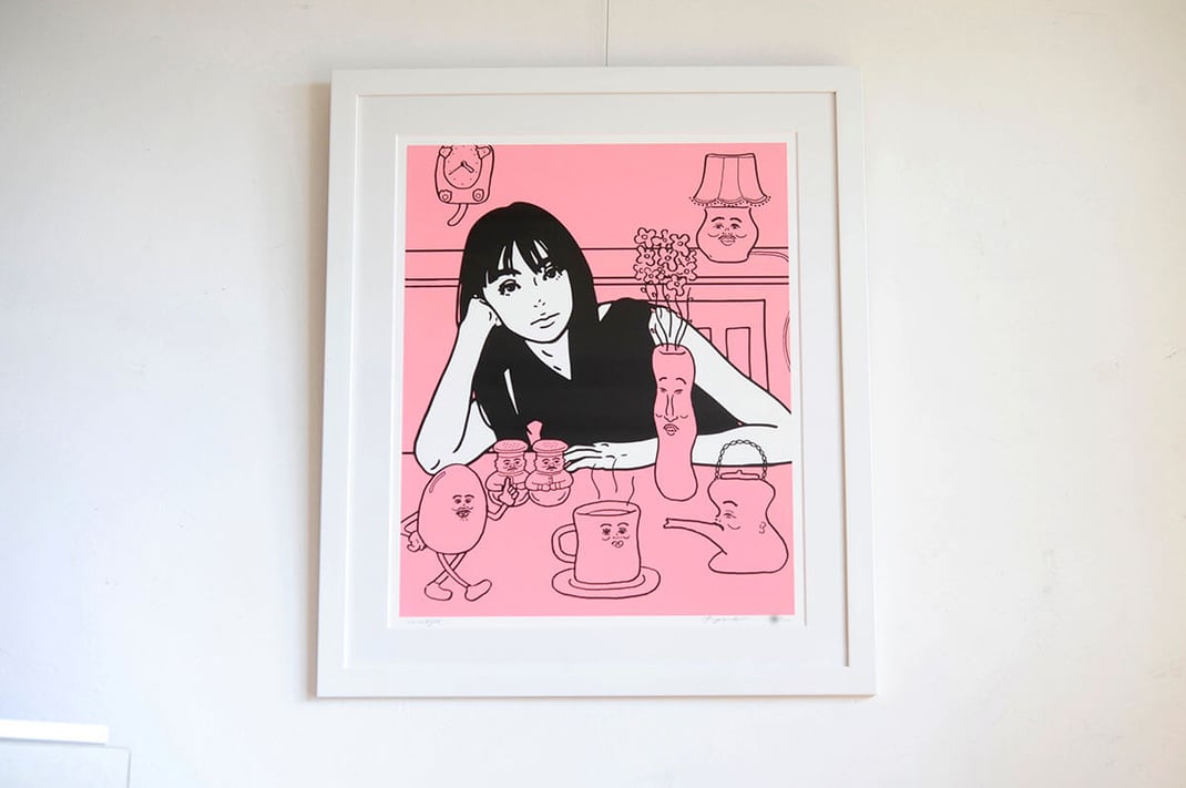 KYNEとNONCHELEEEのコラボ作品を額縁は「Eternity White」、マットボードは「ノーマル白」で額装しました。