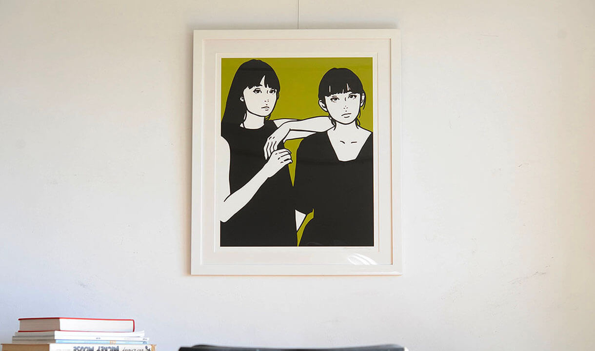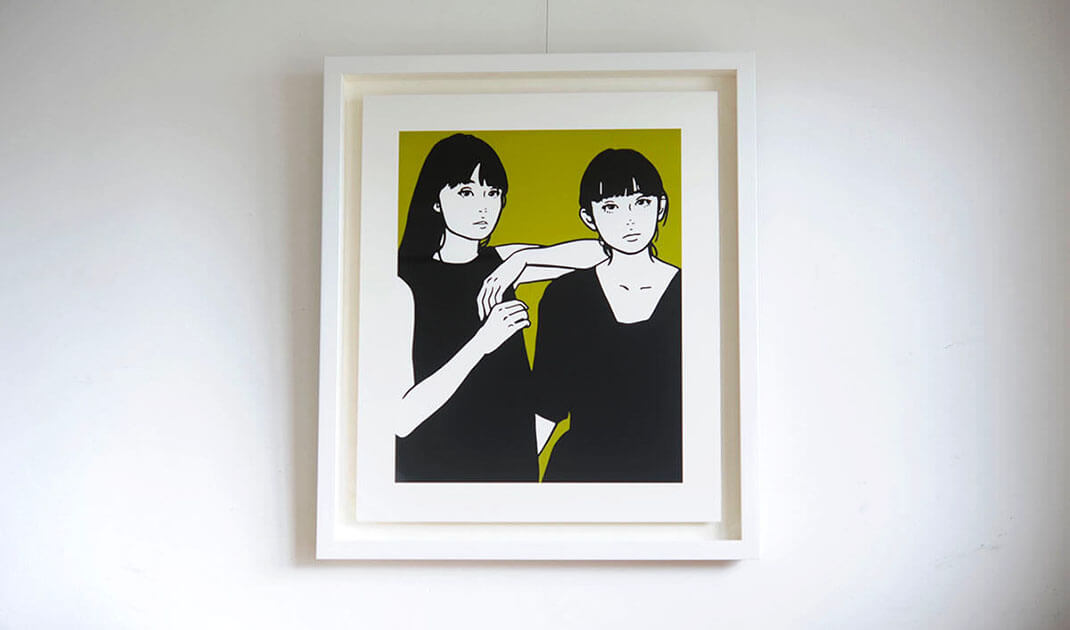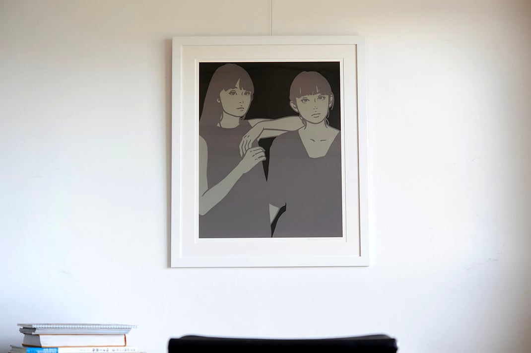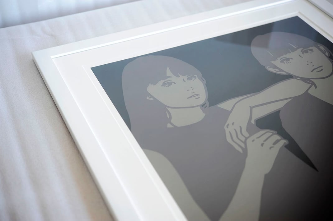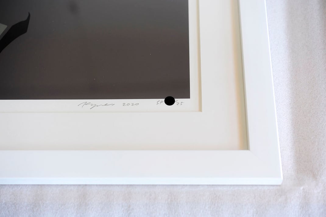 作品に使われている色のどれかとフレームの色を合わせるのは1つのセオリーですので、通常であれば黒のフレームで額装いただくことが多い作品ですが、今回はあえて白の額装でご依頼いただきました。