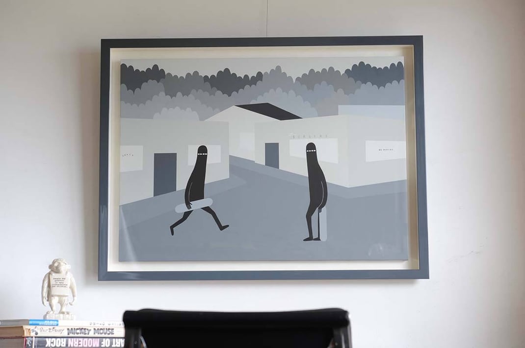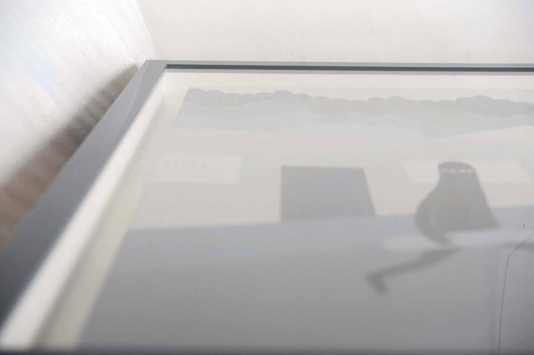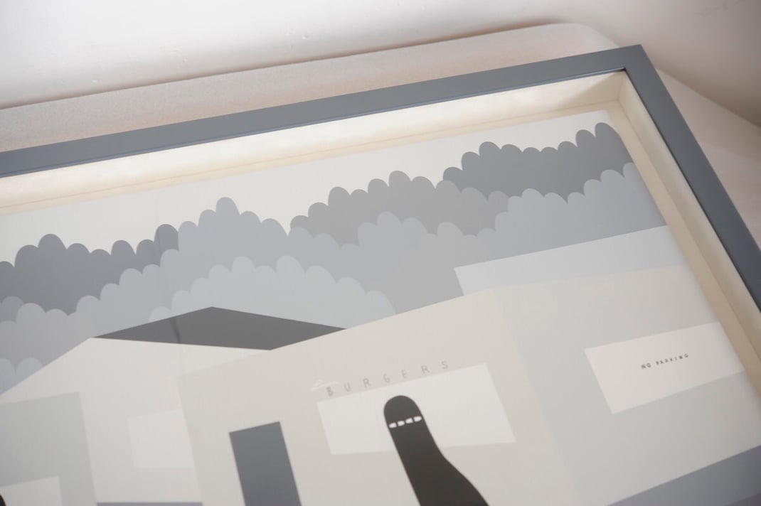 今回はLyの独自の世界観との調和を考えたらこれしかないなと思い、独自に調合して作ったトーンの違う3種類のグレーのフレームをご提案しました。 作品の中に描かれた木々達に合わせて【濃いグレー】【ミディアムグレー】【ライトグレー】の3色です。