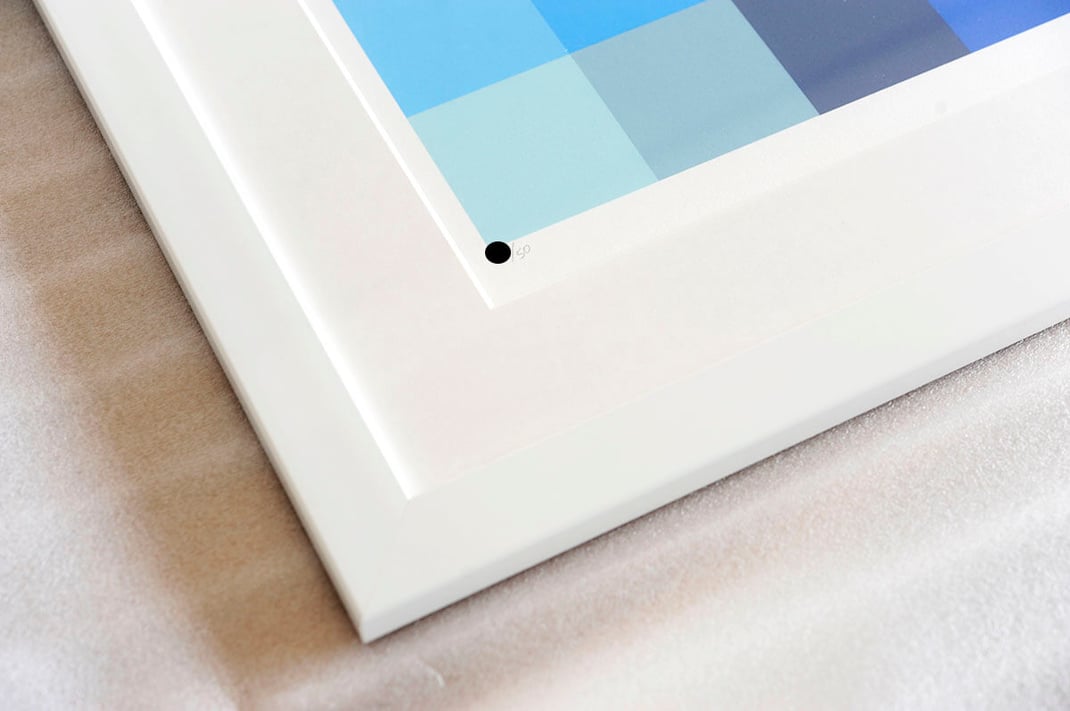 カラフルなピクセルが規則的に並んだ、シンプルでありながらも洗練された今回の作品に、同じ特徴を持った額縁 Eternity Whiteがぴったりハマっています。