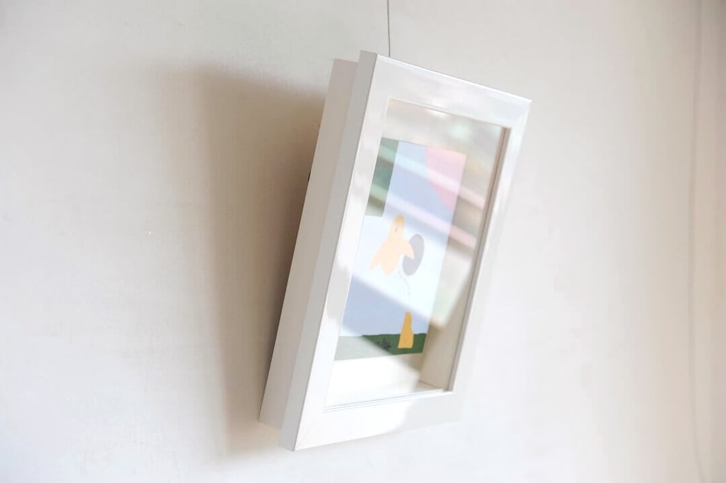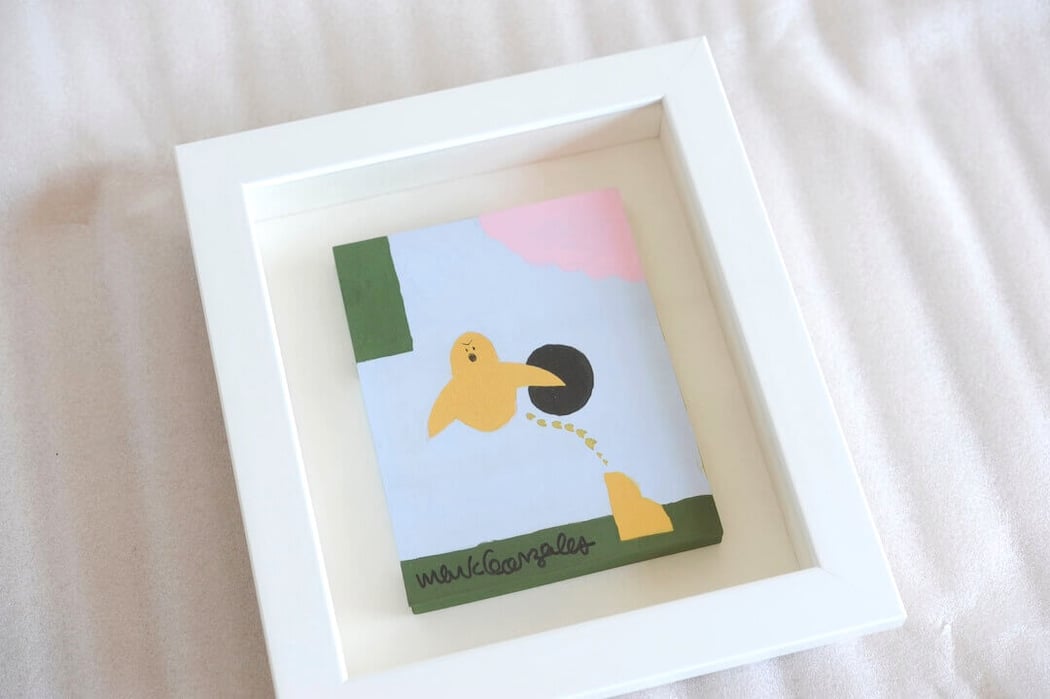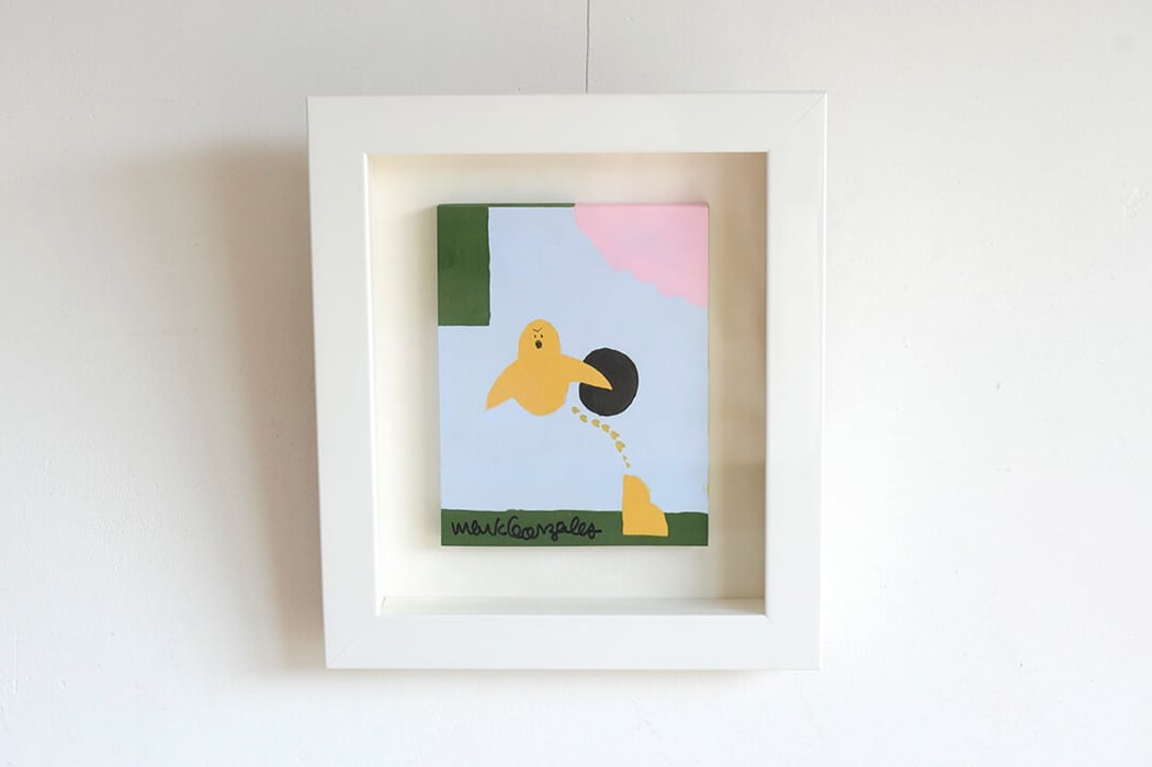 Mark Gonzales(マーク・ゴンザレス)のUntitledを額縁は「Eternity White」、マットボードは「コットンスエード白」で立体的に額装しました。