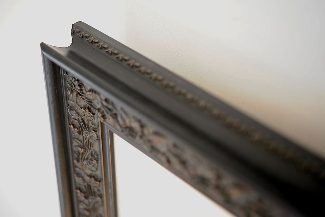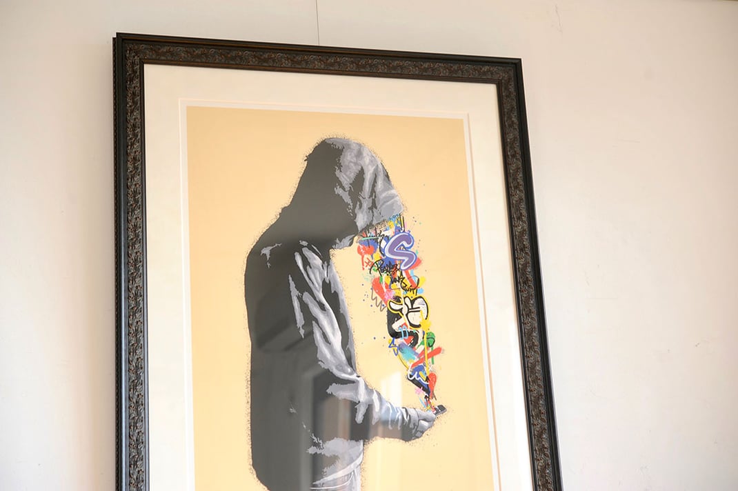 額縁 Vinesは、ひとつ間違えるとダサくなってしまいがちなレリーフ(彫刻)が施されていますが、このフレームにおいては、ブラックの合間にところどころ下地に含まれたゴールドが顔をのぞかせるなど、エイジング感が絶妙な色づけで、グラフィティアートとの相性を良くしてくれています。