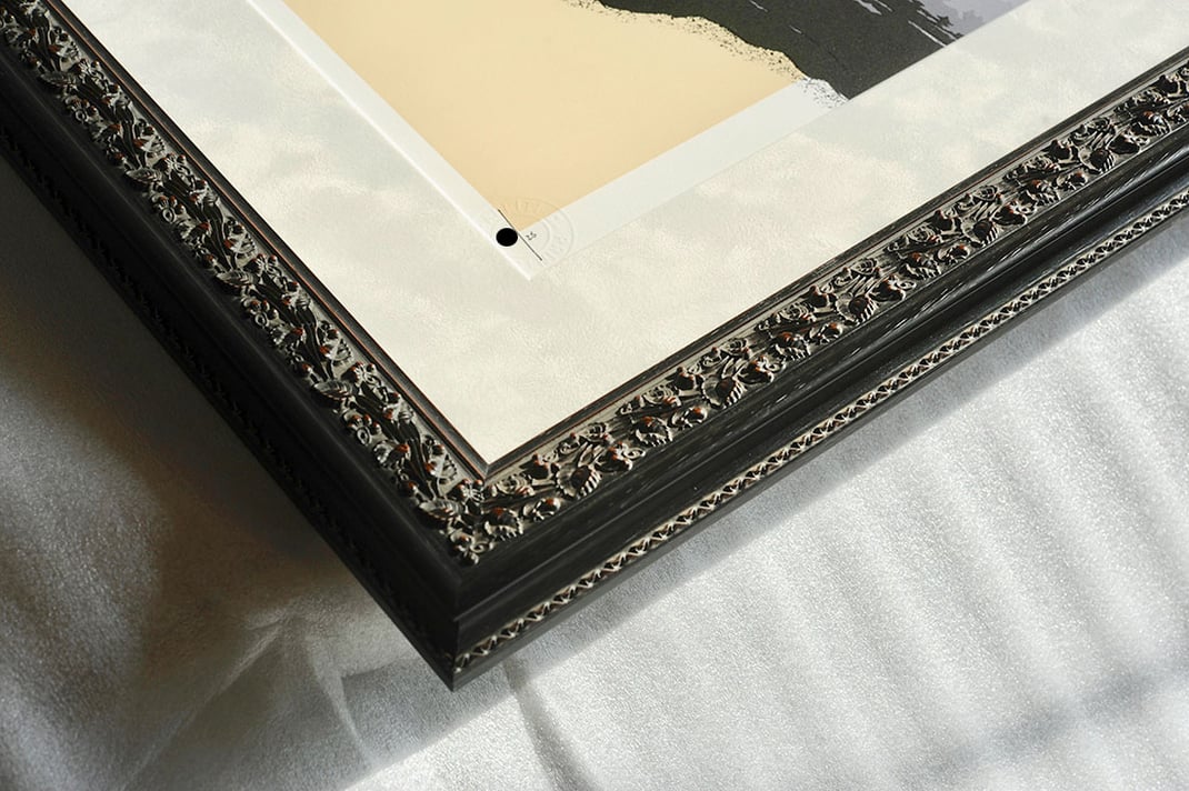 インパクトのあるデザインでありながら、お行儀の良い名画からラフな雰囲気のグラフティアートまで意外と守備範囲が広いフレームですが、残念ながら日本のご家庭ではなかなかに飾りにくいのか、ご依頼いただく件数はかなり少ないので「是非、額装したい!」という方、お待ちしております。