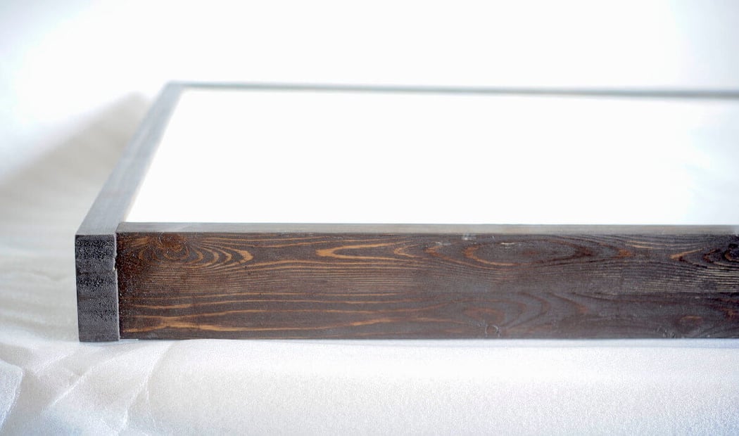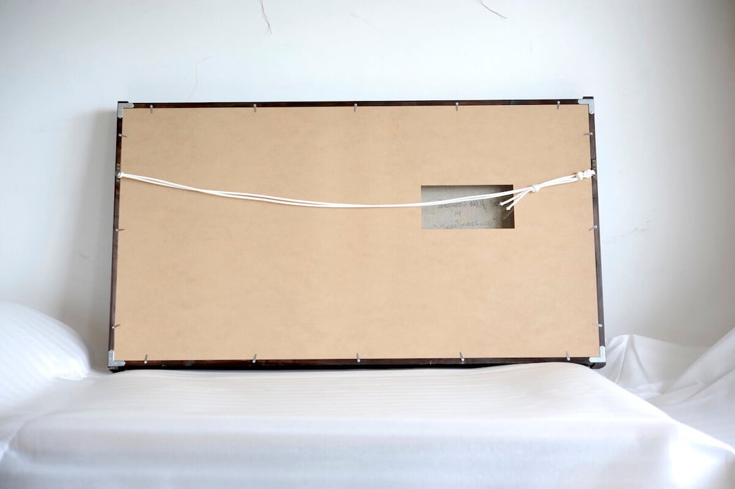 今回は大きい作品(縦50cm、 横1m)なので額装の総重量が少し重くはなりますが、F 様のご希望で作品の裏面に一切、手を加えることなく、作品を額装の中に固定できる凸型に特殊加工したアクリルのケースを使用しています。