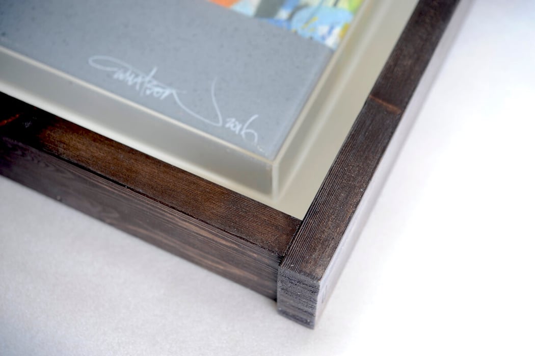 裏面はアーティストのサインと作品タイトルが入ってるいるので、額装の裏面にもアクリルを付けて裏板をくり抜いて見えるようにしています。