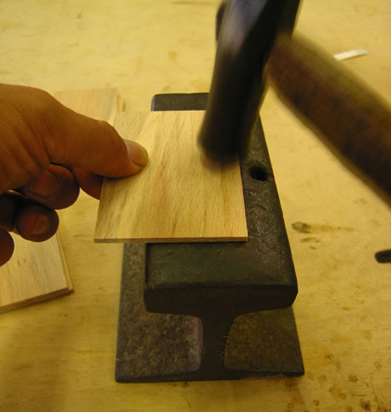 (3)少しきつめにしておいたサネをカナヅチで叩き、少し潰します。