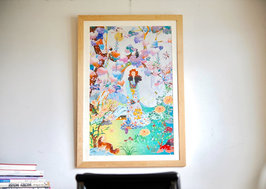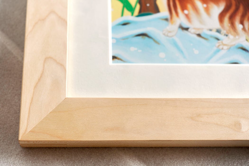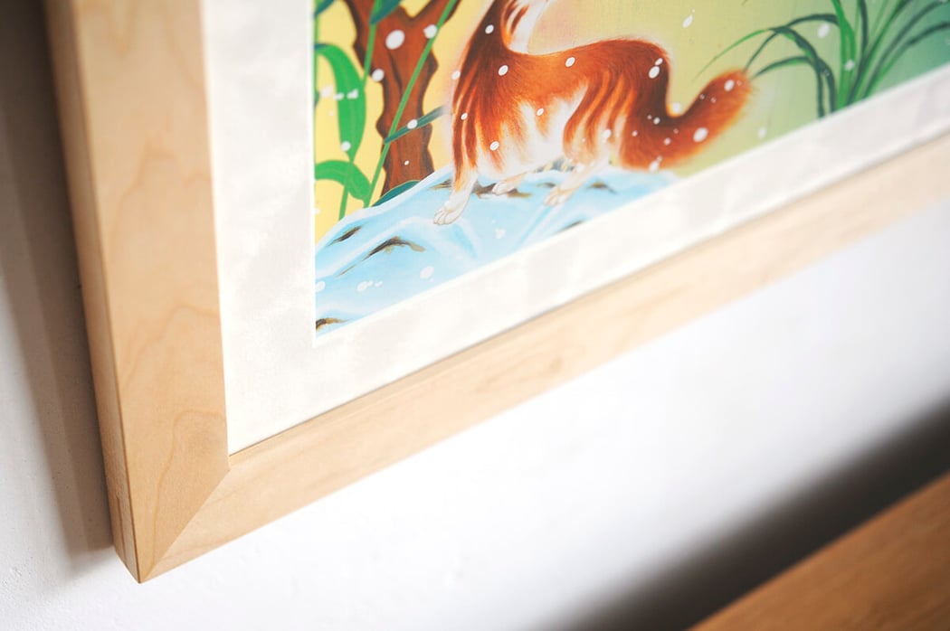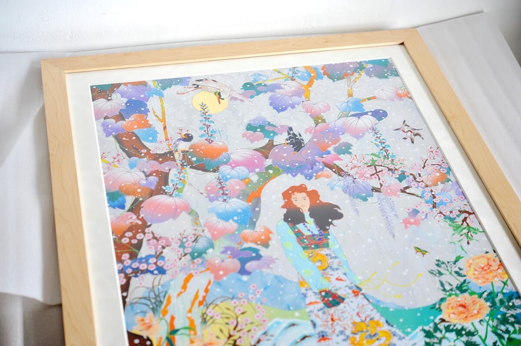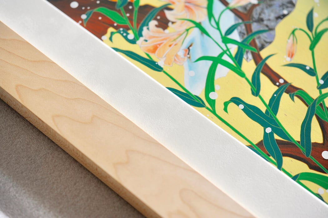 美的センスに溢れる松山智一の作品達の中でも一番美しいんちゃうか!と思えるほど今作は思わず見惚れてしまう程にとにかく美しいです。 この作品には多くの人が無難に白いフレームの額装で行きそうですがO様は、Maple材(カエデ)のフレームを選択されました。