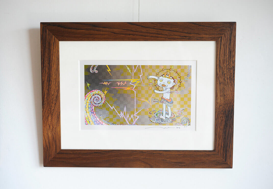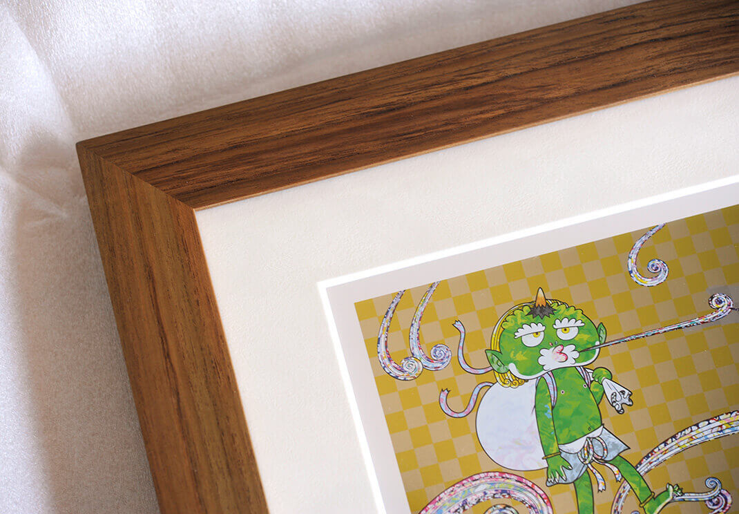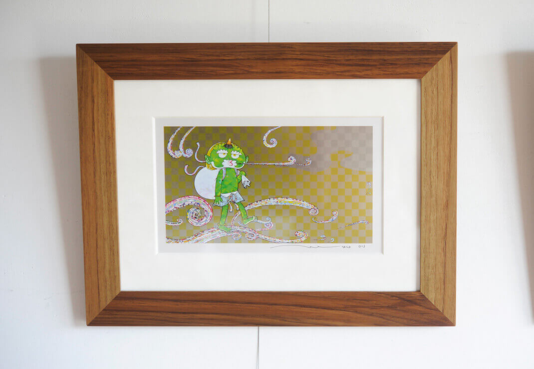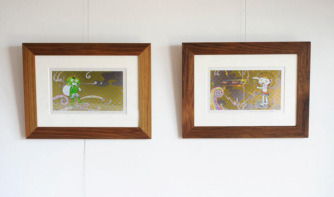 村上隆の雷神図・風神図を額縁は「TEAK」、マットボードは「コットンスエード白」で額装しました。