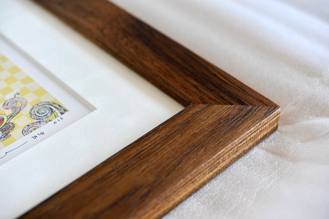 今回の額縁 TEAKは、マホガニーと並ぶ優良高級材として様々な用途に用いられる銘木のチーク材を使用しており、材質は堅く強靭で耐久性があり、病害虫にも強く、天然の油成分があって、オイルやニスで手入れをしなくても耐久性があります。