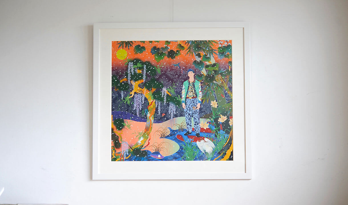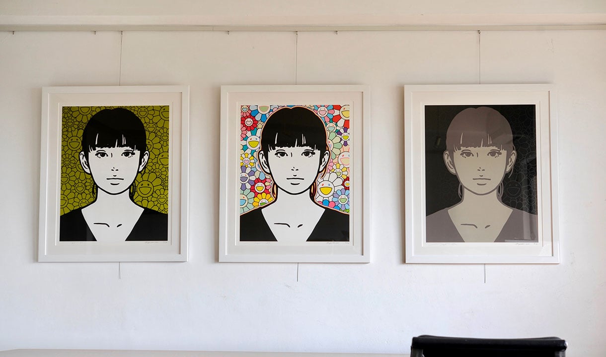 村上隆の作品は目にするだけで、気持ちがパッと明るくなるようなカラフルでインパクトのある配色とキャラクターの明るい表情が持ち味ですが、今回の「お花の森」も例に漏れず、作品単体にインパクトがありますので、余計な小細工は無しで、シンプルな白のフレーム×白のマットボードでまとめました。