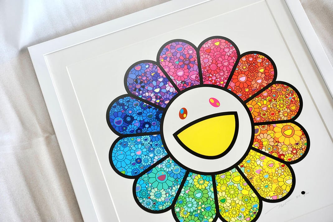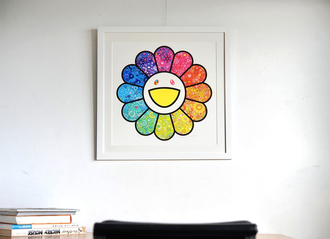 村上隆の"お花の森"を額縁は「Eternity White」、マットボードは「ノーマル白」で額装しました。