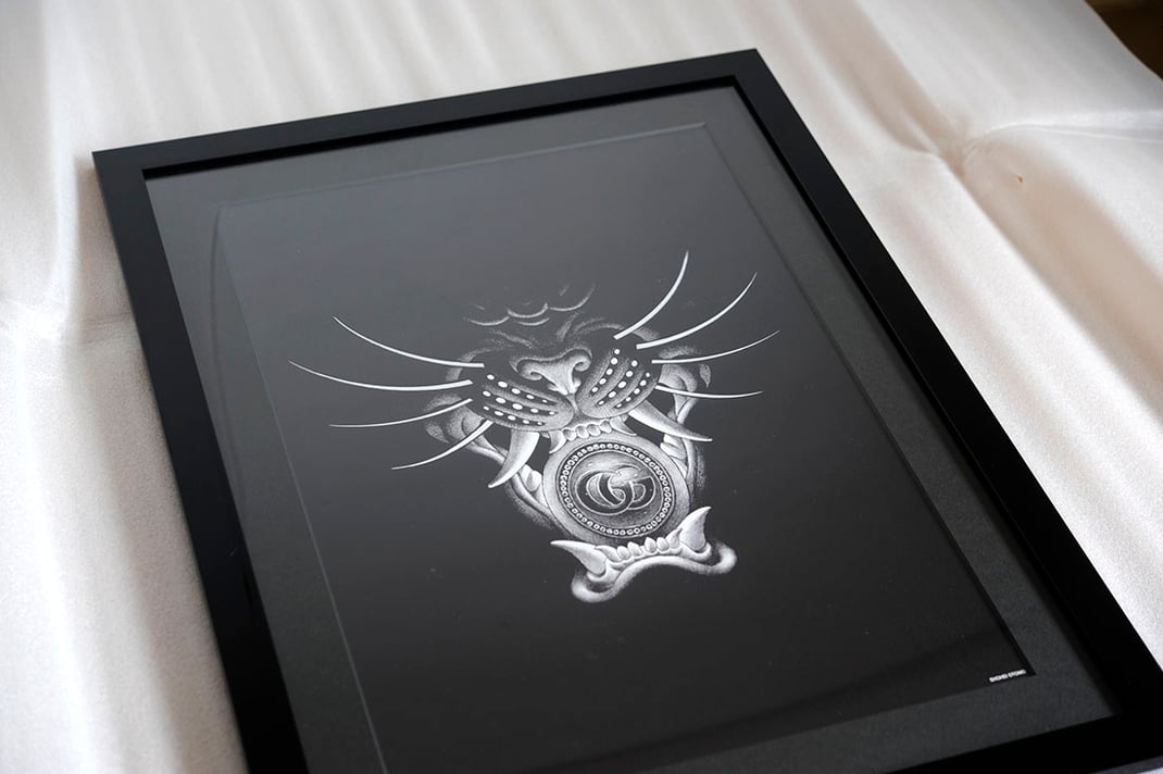 大友昇平× GUCCIのコラボレーション作品「GUCCI(獅子)」を額縁はEternity Black、マットボードは「エンボス / 黒」で額装しました。
