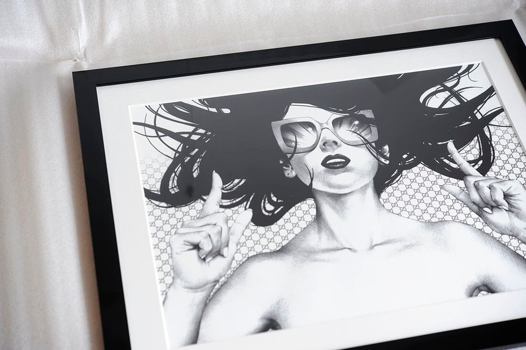 12月1日のこちらの額装に引き続き、大友昇平× GUCCIのコラボレーション作品「GUCCI(Woman)」を額縁は「Eternity Black」、マットボードは「ノーマル白」で額装しました。