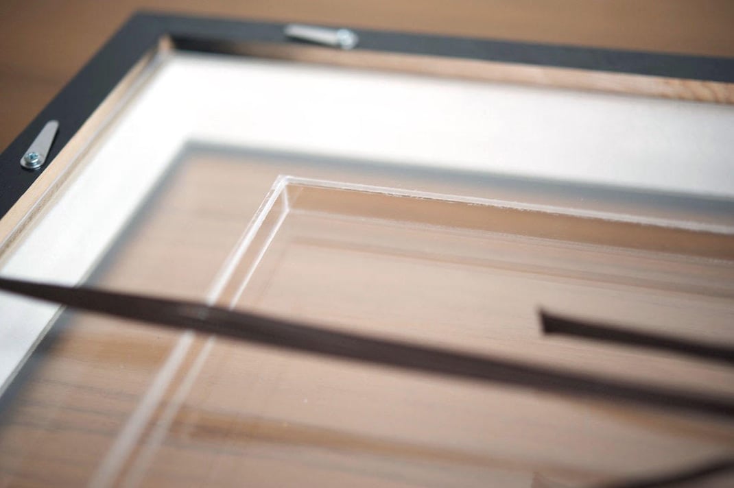 でも、このアクリルのケースはマットボードや裏板にどのように固定しているのかなぁと、次の疑問が湧いてきます。