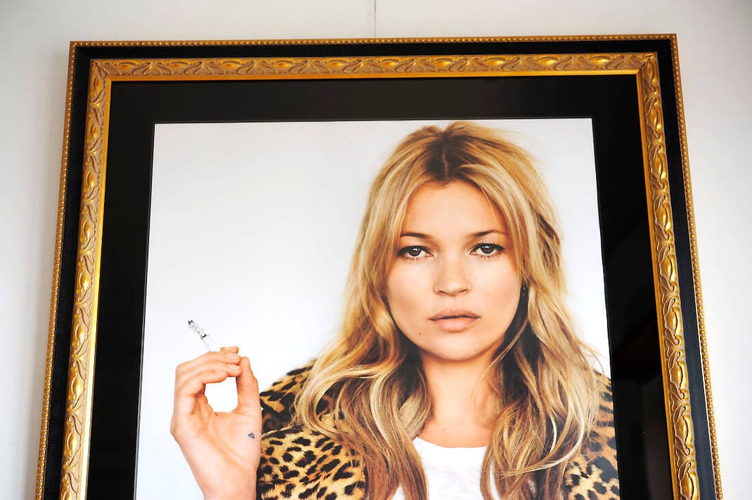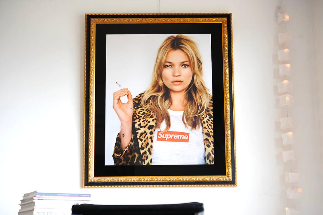 Supreme(シュプリーム)の「ケイトモスのポスター」を額縁は「NOISEPRINCE - Gold」、マットボードは【ベルベット素材の黒】で額装しました。