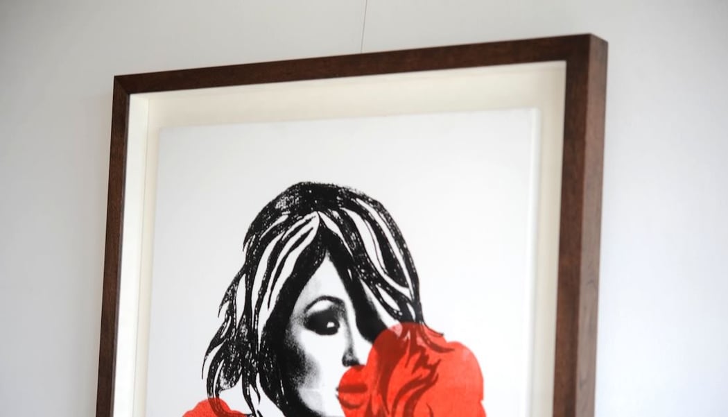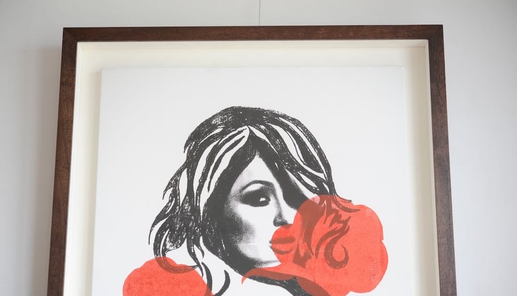 WRONGWROKS / ウロングウロックスの「S for Paris Hilton Red Bubble -Canvas」を額縁は「WALNUT Black Brown」、マットボードは「コットンスエードの白」で額装しています。